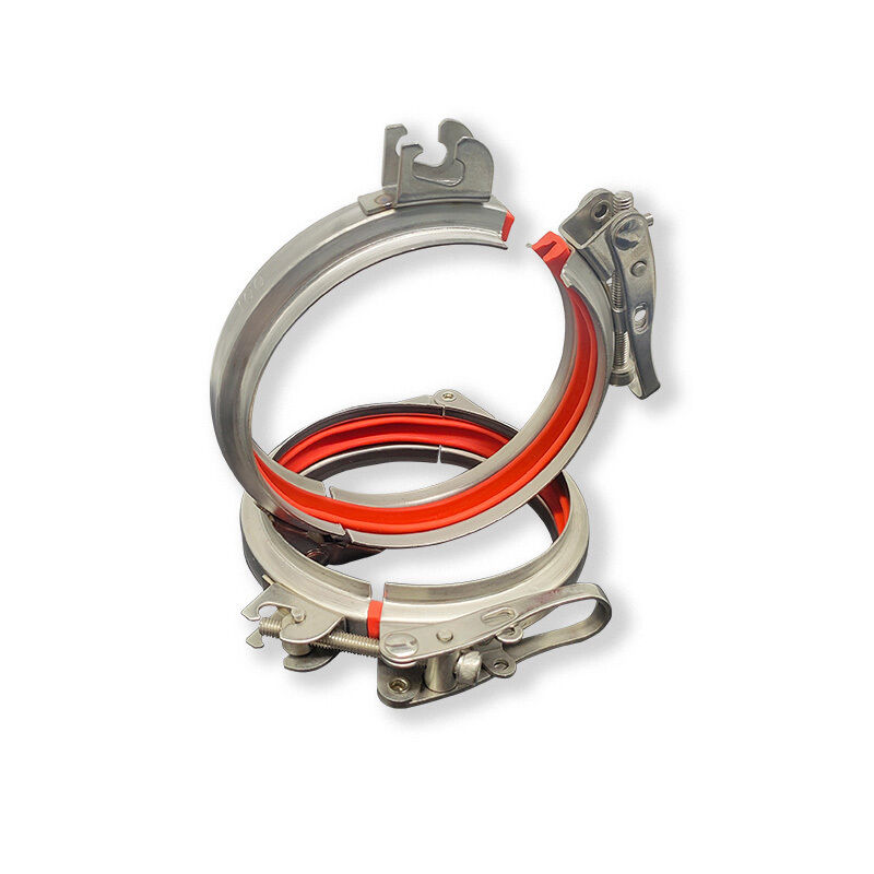 The connecting clamp used for ventilation flipping pipes has a thickness of 0.8-1.2mm for the clamped pipe and a flange height of 5.5-6.5mm for the clamped flange
